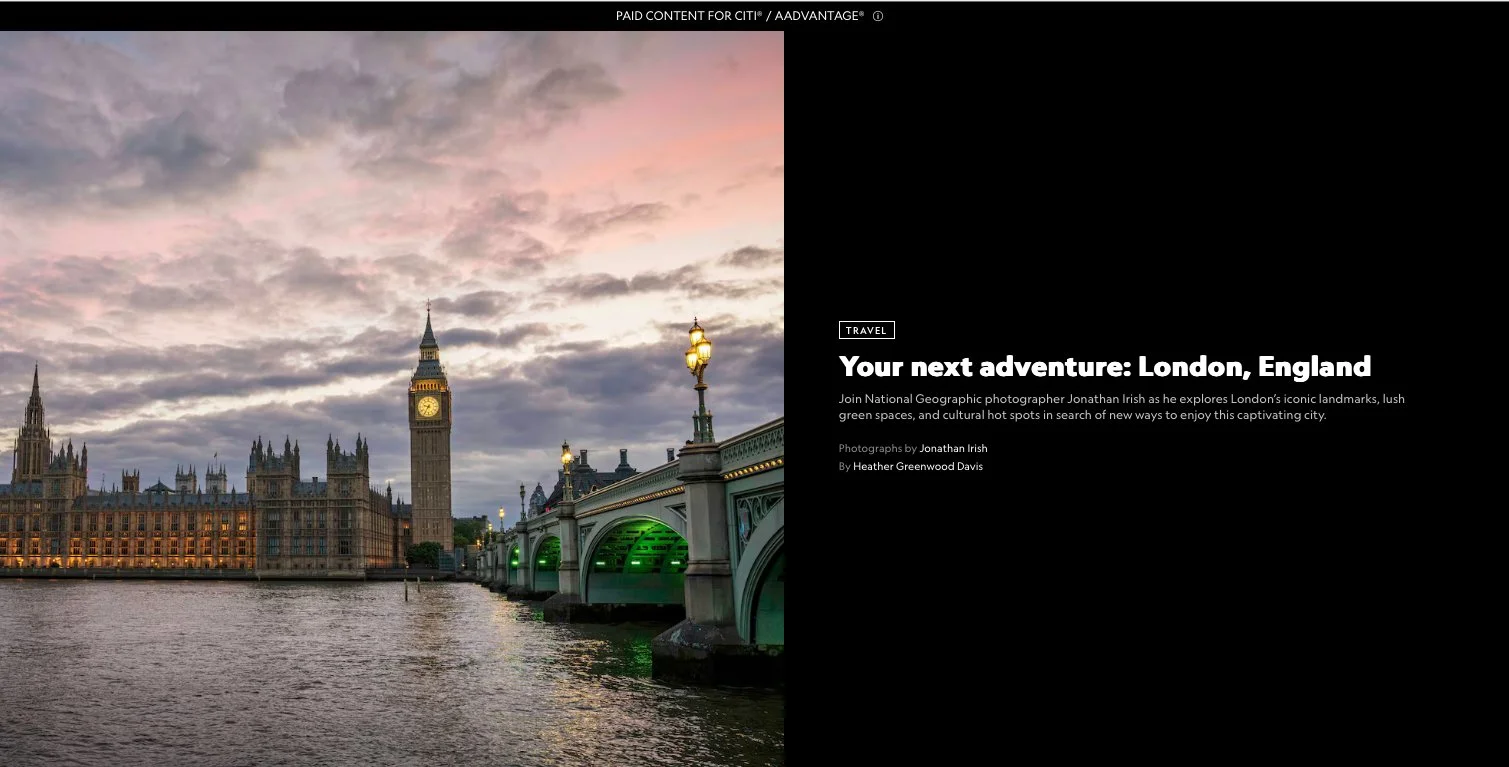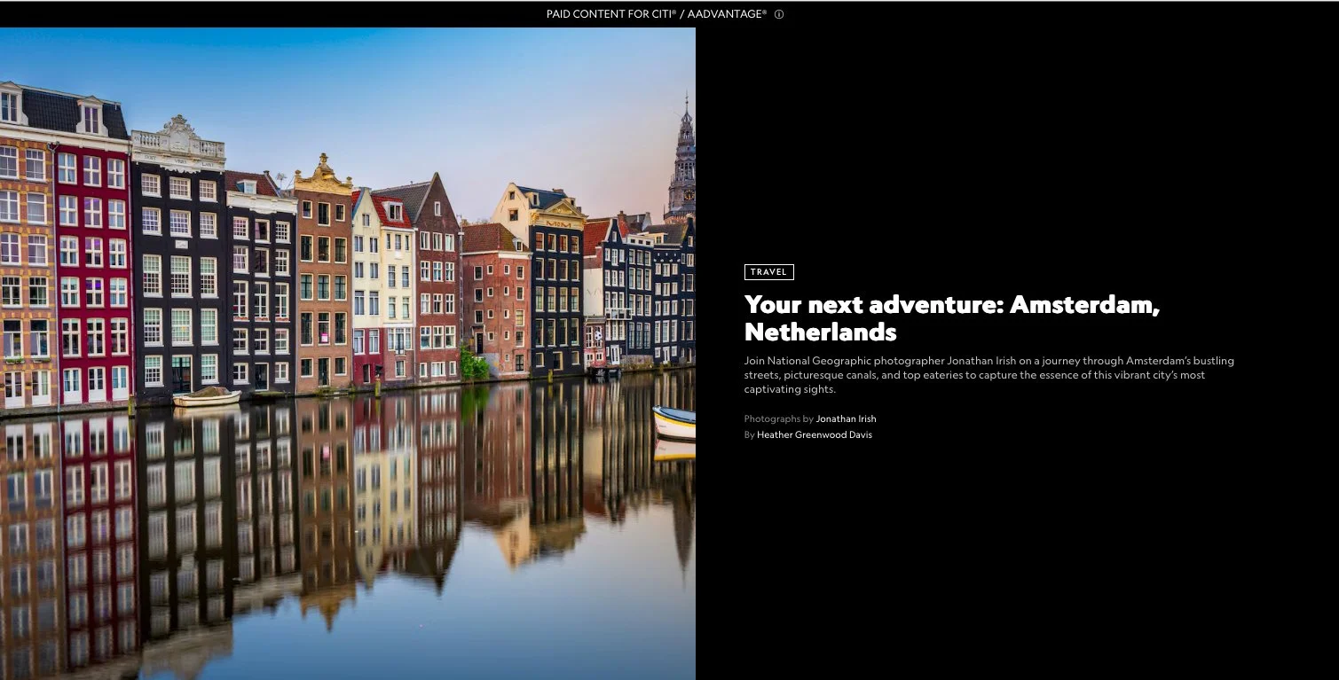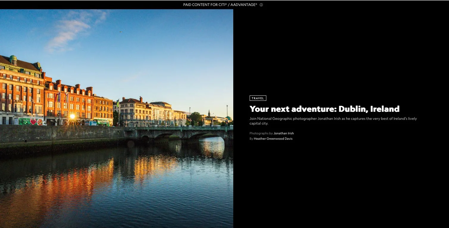 Citi, American Airlines and Nat Geo collaborated to position the Citi® / AAdvantage® Platinum Select® card as the card that ignites exploration. The Nat Geo team joined travel photographer (and Platinum cardholder), Jonathan Irish, on a journey across Dublin, Amsterdam, and London to collaborate on a scenic content series that invited Nat Geo followers to discover what makes these cities must-visit destinations. Content included custom photo posts, vertical videos, and vertical stories across Nat Geo’s social accounts, a :60 trailer streaming on Hulu, and in-depth articles and travel guides on natgeo.com that encouraged our audience to travel on and find “Your Next Adventure”.